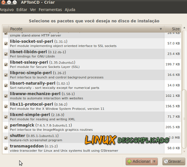 Sendo assim, é preciso conhecer o APTonCD. Ele é uma ferramenta com uma interface gráfica que permite criar um ou mais CDs ou DVDs (você escolhe o tipo de mídia) com todos os pacotes que você tenha baixado via apt-get ou aptitude, criando um repositório removível que você pode usar em outros computadores.