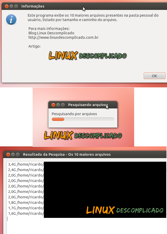 Este script, carrega um tela inicial de aviso (zenity –info) e posteriormente invoca um processo de carregamento (zenity –progress), onde simultaneamente roda o comando find para buscar os 10 maiores arquivos da pasta /home do usuário! Por fim, exibe numa janela de texto (zenity –text-info) o resultado encontrado, como segue as imagens: