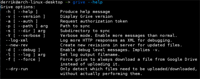 Drive é outro cliente via terminal. É uma ferramenta simples criada para aqueles que apenas querem “upar” ou baixar” arquivos ocasionalmente. Francamente, este programa não é tão bom quanto o Grive.