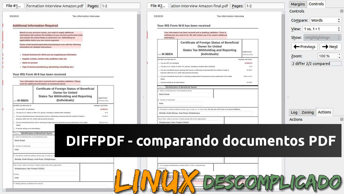DiffPDF é um programa que permite comparar dois arquivos PDF e analisar as diferenças entre documentos PDF. Isso é bastante útil se você tiver várias versões do mesmo documento. O programa é muito intuitivo, basta carregar os arquivos PDF e pressionar o botão “comparar” para analisar as diferenças.