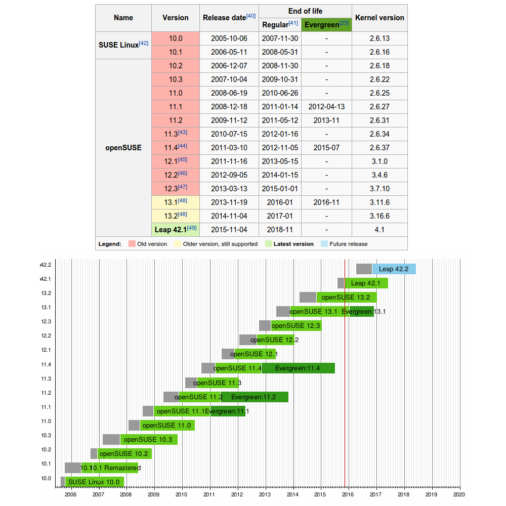 Por fim, a exatamente 1 ano depois do lançamento da última versão estável – OpenSUSE 13.2 (fixed release)- foi divulgado a Leap. Conforme notícias, quem possui instalado o openSUSE 13.2 (somente essa, não anteriores) poderá atualizar para o openSUSE Leap 42.1; seguindo as instruções oficiais. Assim, o ciclo 13.x (13.1 e 13.2) está chegando ao fim, com versões 13.1 com suporte até Nov/2016 (Evergreen – suporte estendido) e a 13.2 até JAN/2017.